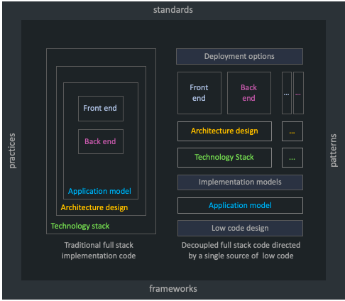 Write once all your application logic and flow in a single low code programming language and create automatically powerful machine-readable declarative logic semantics for your application, which you can reuse to generate code for different technology stacks and share with community developers to scale up your software